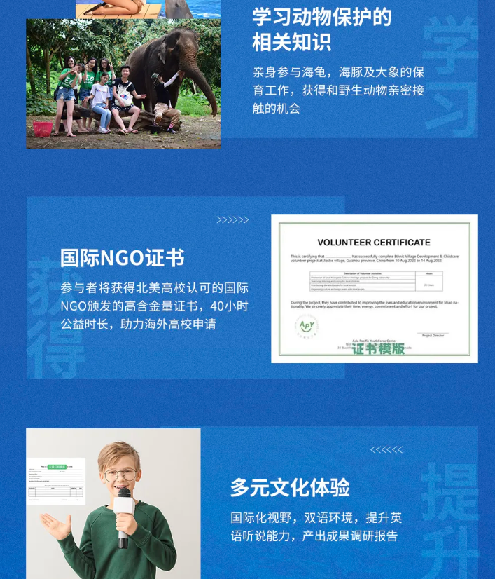 营员们能够亲手照顾受伤的海龟,使它们能够健康地重返海洋,同样可以和海豚来个亲密接触,以及亲手照顾亚洲象,此外,所有收集的数据都将传递给世界海洋保护组织,为全球环保事业贡献一份力量。