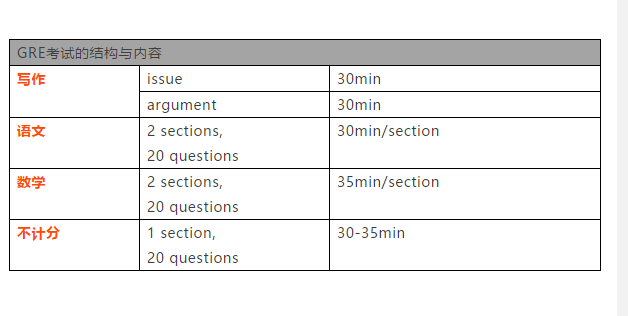 新的GRE考试总耗时约为3小时45分钟,外加考生中场休息时间,共有6个部分: