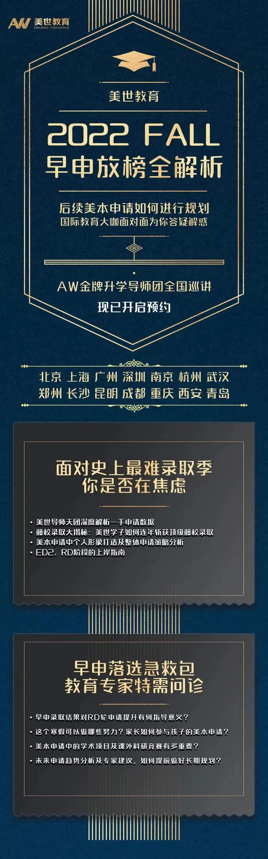 如果你还想知道2022Fall早申录取较往年有哪些特征和变化?别急,美世教育金牌升学导师团将来到您的身边,全国14城巡回讲座,现已开启预约!