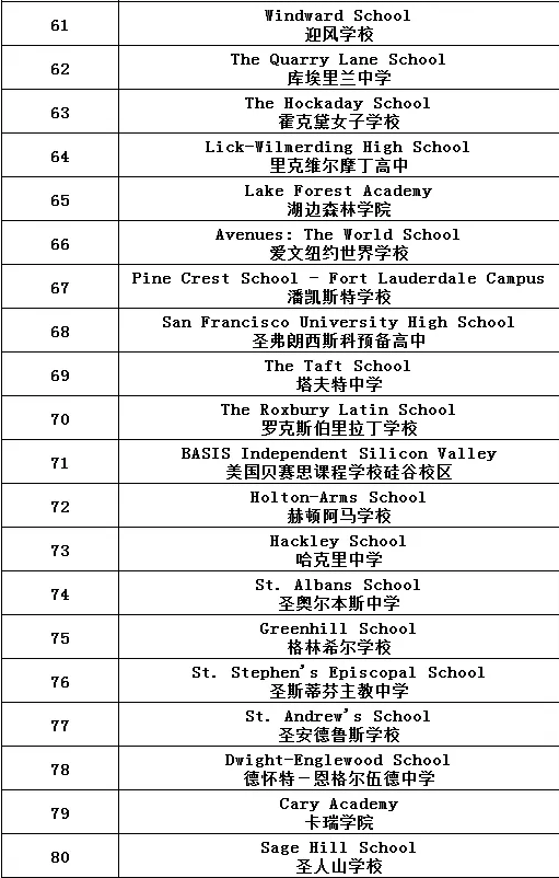 菲利普斯埃克塞特中学 (Phillips Exeter Academy) 位居第2名, 霍奇基斯中学 (Hotchkiss School) 从第17名升至第5名,劳伦斯威尔 (Lawrenceville School) 从第10名跌至16名。