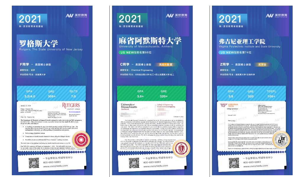 2021美国大学本科录取战况:TOP 20院校12人录取,TOP20-50 277人录取;2021美国大学硕博录取战况:TOP 10院校157人录取,TOP10-50 788人录取。