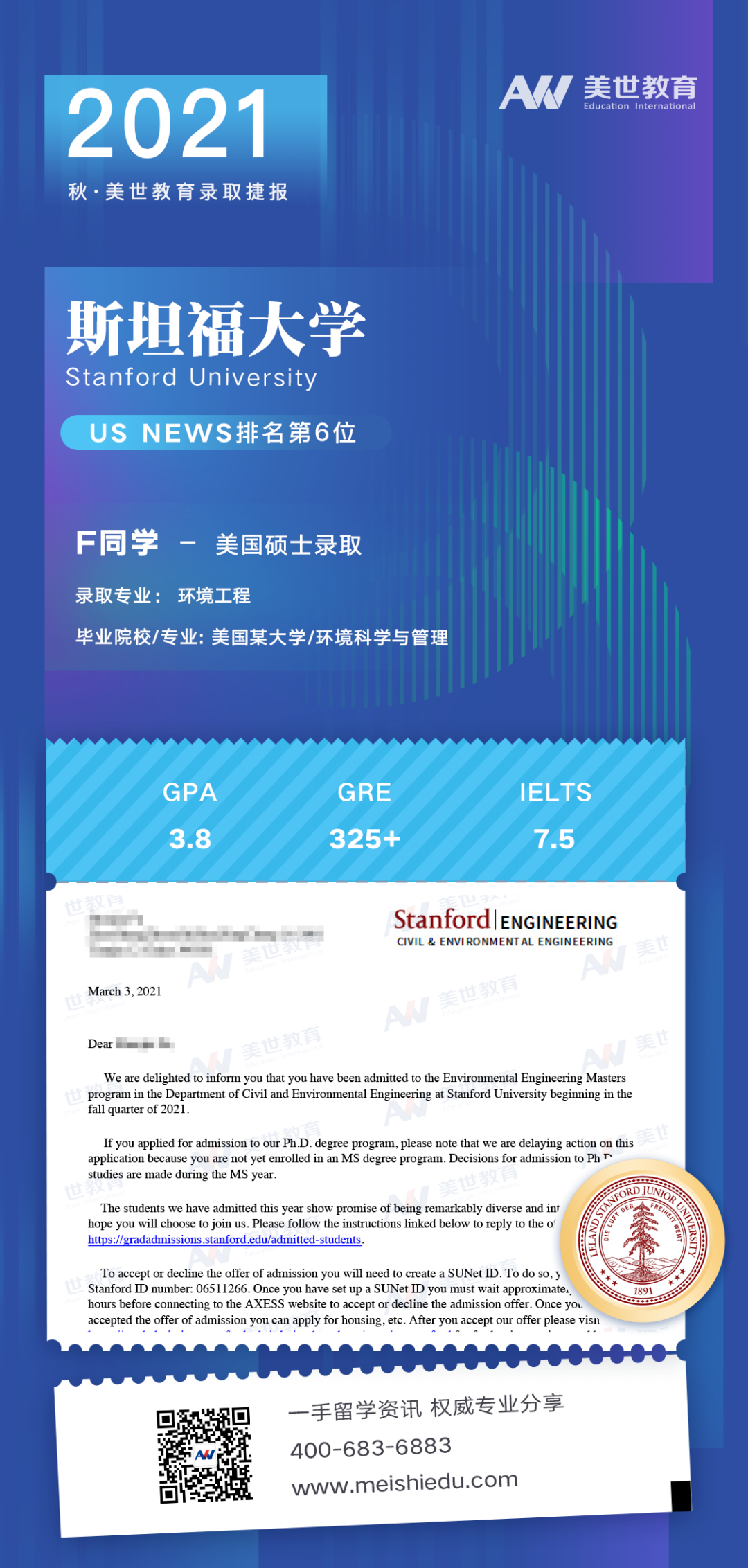 可喜的是,美世学子Y同学、F同学分别成功斩获斯坦福大学工程学院(排名第2)录取!