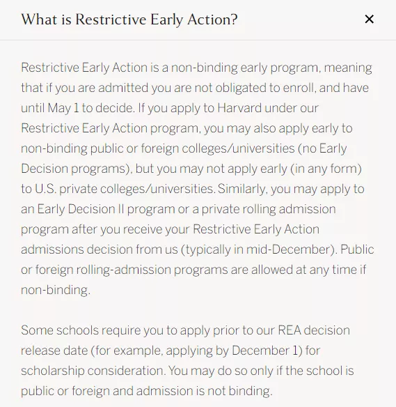 如果你通过REA申请哈佛,你可以同时申请公立大学或者其他美国之外的院校,但你不能申请其他私立大学的EA及ED。