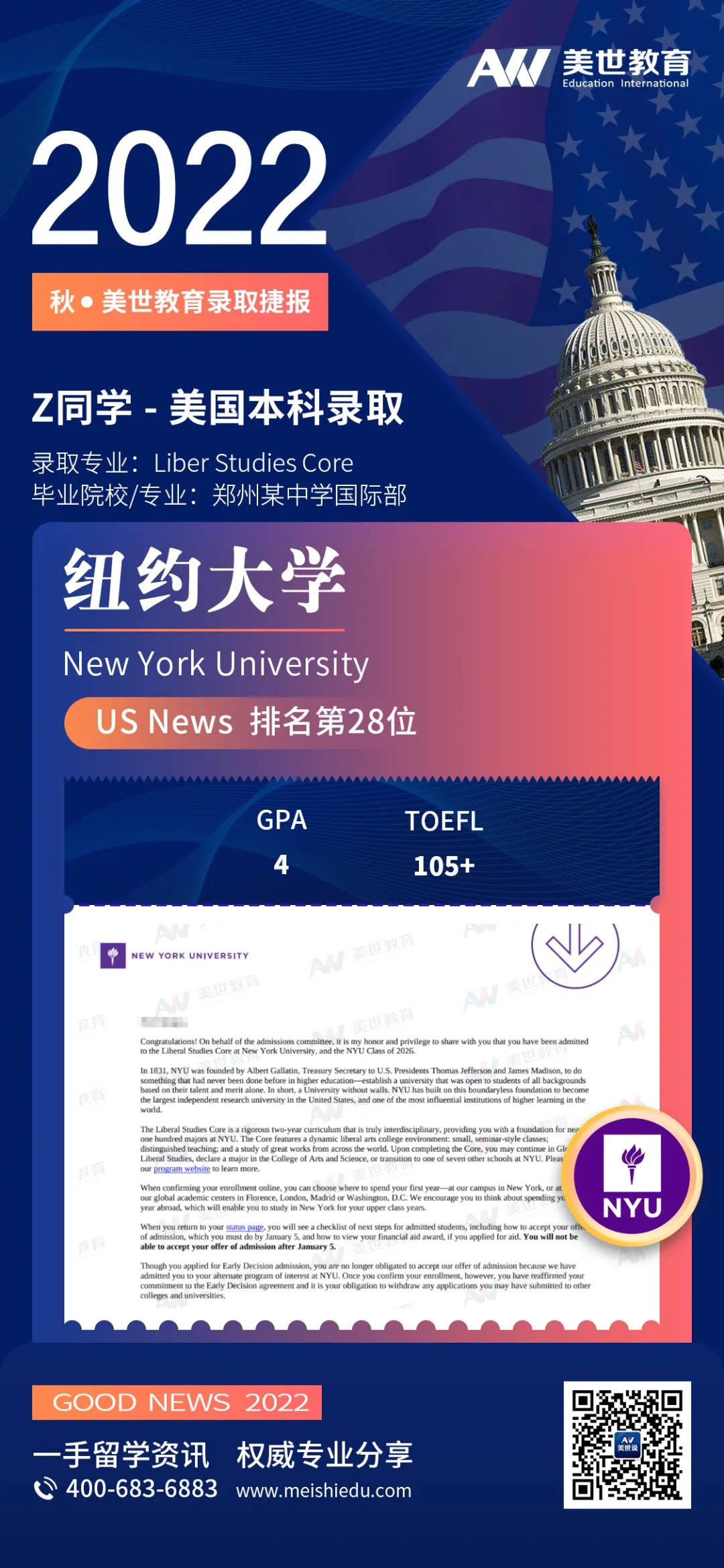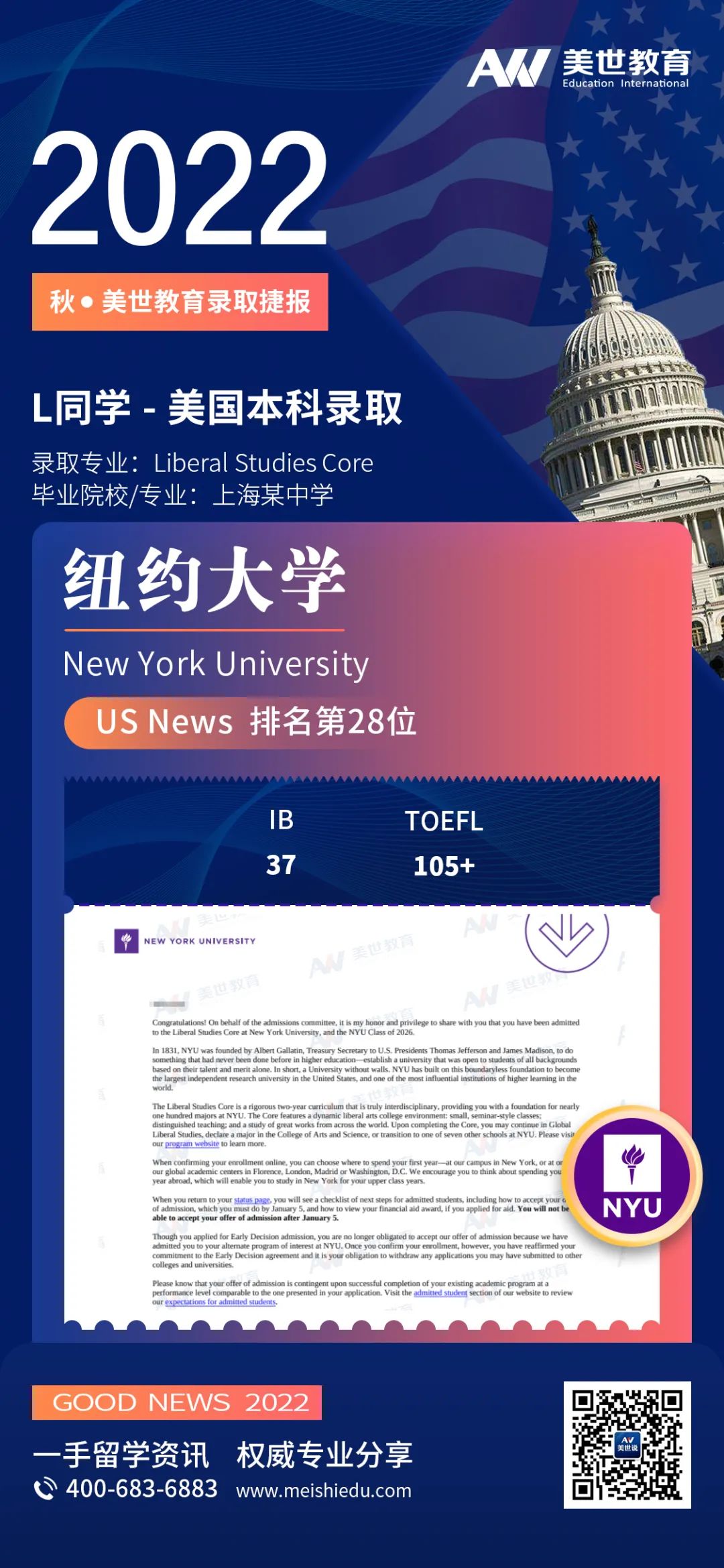H同学今天能够收到纽约大学的Offer,也是意料之中,再次恭喜H同学以及美世顾问老师们。期待美世学子在接下来的美本放榜季,带给我们更多惊喜!