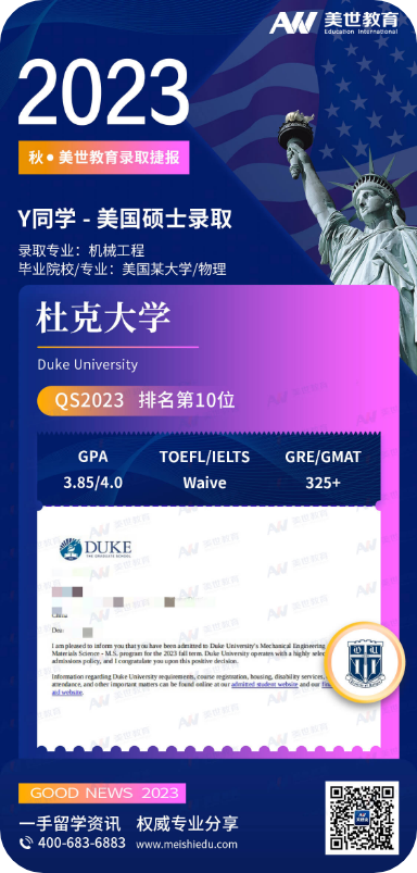 美世捷报 | 恭喜Y同学斩获美国杜克大学硕士offer